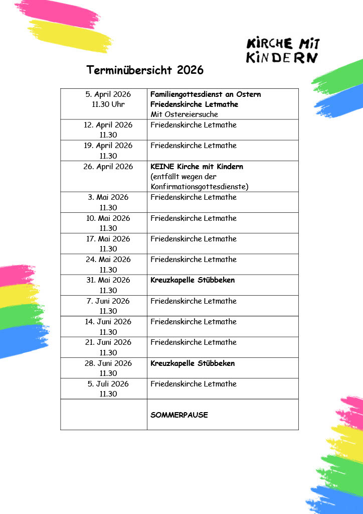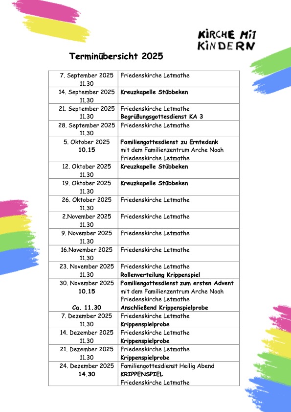 Jeden Sonntag (außer in den Sommerferien) treffen wir uns um 11:30 Uhr in der Friedenskirche, um gemeinsam zu singen, zu lachen, Geschichten zu hören und jede Menge zu erleben. Es steht immer eine spannende biblische Geschichte im Mittelpunkt, die wir auf kindgerechte Weise erzählen, spielen oder kreativ gestalten. Mal wird gebastelt, mal gesungen, mal gibt es kleine Rollenspiele oder Aktionen – langweilig wird es bei uns nie! Unsere Kirche mit Kindern ist ein Ort, an dem sich alle willkommen fühlen dürfen. Egal, ob die Kinder jede Woche kommen oder einfach mal reinschnuppern möchten – bei uns ist jede und jeder herzlich eingeladen. Wir freuen uns über neugierige Fragen, fröhliches Mitsingen und auch mal lautes Lachen. Unser Team besteht aus engagierten Mitarbeitenden, die mit viel Herz, Ideenreichtum und Begeisterung dabei sind. Uns ist wichtig, dass sich die Kinder wohlfühlen und erfahren: Glaube kann fröhlich, lebendig und mitten im Alltag sein.